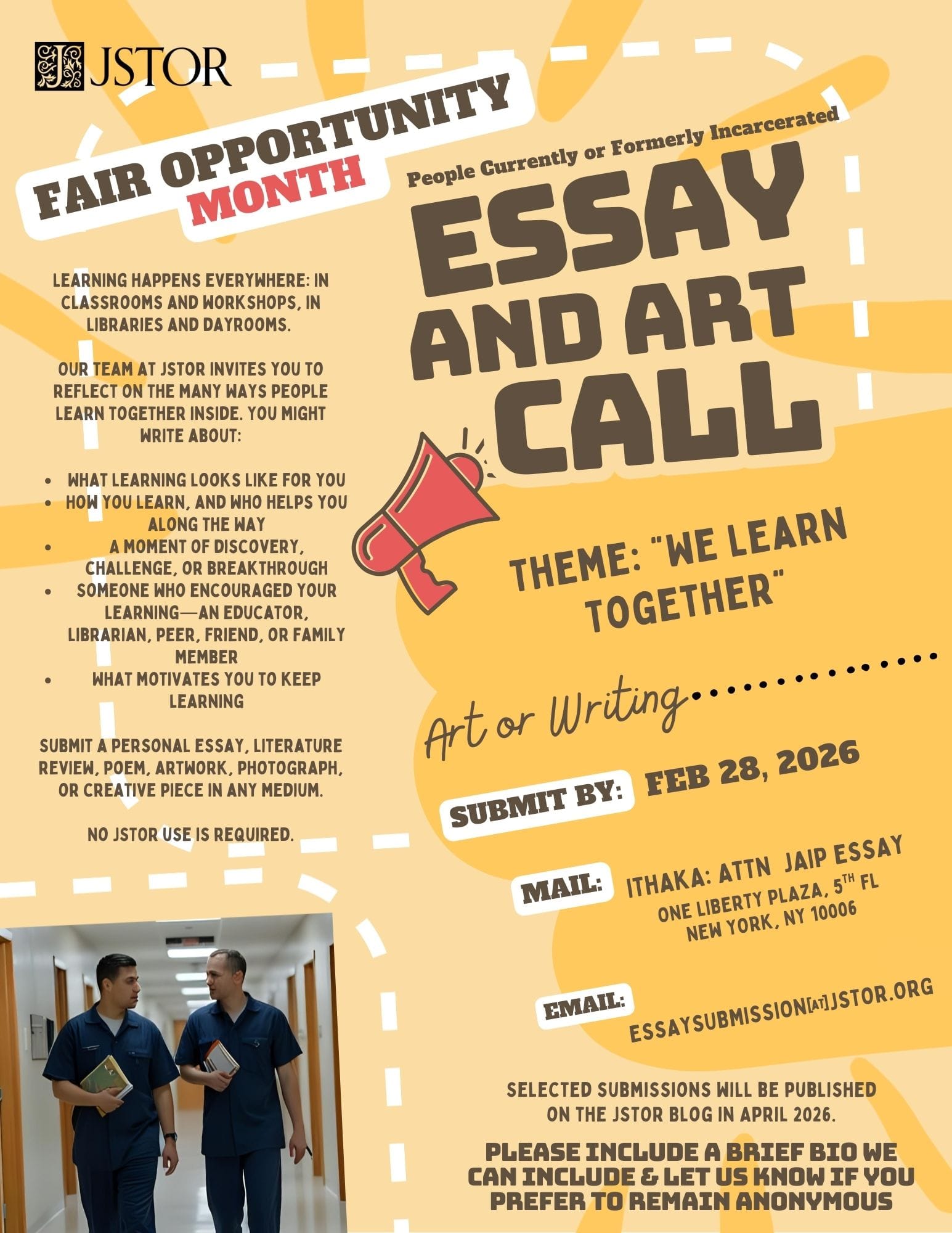 The JSTOR Access in Prison team is proud to announce our 2026 Fair Opportunity Month Open Call for Submissions. Each year, we dedicate April to uplifting the voices, experiences, and creativity of people who have lived, learned, and persevered inside carceral settings. This is our fourth year running this project, and every cycle reminds us how much wisdom, talent, and insight exists inside carceral settings.